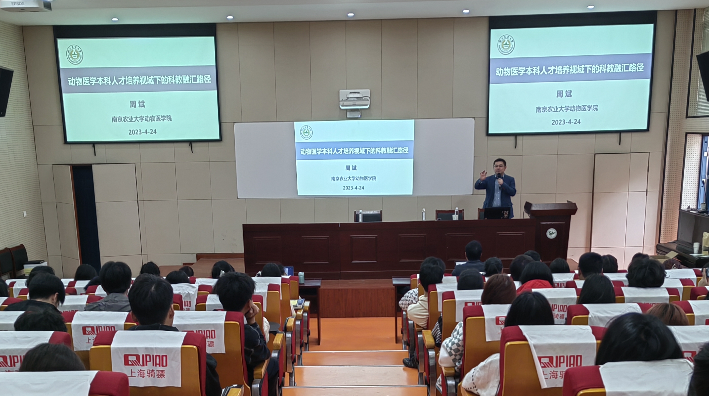 为进一步提升我院动物医学本科建设质量,拓展师生在动物疫病领域的视野,424日上午,学院特邀南京农业大学预防兽医系主任,《畜牧与兽医》杂志主编--周斌教授在骑骠报告厅作《关于动物医学本科人才培养视域下科教融汇路径》的学术讲座。畜牧兽医和动物医学专业共有百余名师生代表参加。