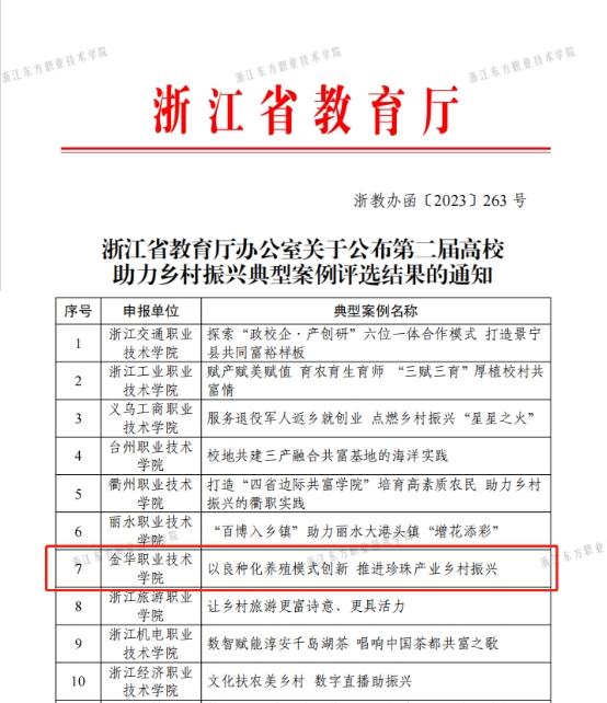 近日,浙江省教育厅发布《关于公布第二届高校助力乡村振兴典型案例评选结果的通知》,金职院报送的《以良种化养殖模式创新推进珍珠产业乡村振兴》成功入选。据悉,本次评选在各高校申报的基础上,经高校互评、专家评审、省教育厅会评等环节,共评选出全省高校助力乡村振兴的典型案例30项,其中本科高校和职业院校各15项。