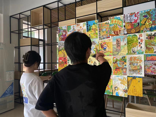 子活动之一是“稻花香里说丰年”主题海报大赛。工作室鼓励全院师生通过视觉形式展现农业丰收的喜悦、反映农民的辛勤劳动,以及展现自身对于农业的关注和重视。本次活动共收集到了60余张海报作品,同学们通过画笔将自己所理解的丰收场景展现在海报之中,赢来了全院师生的驻足欣赏。