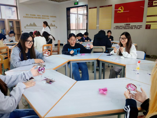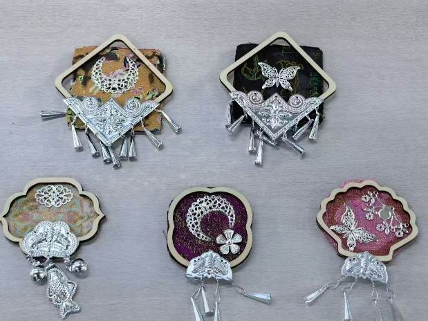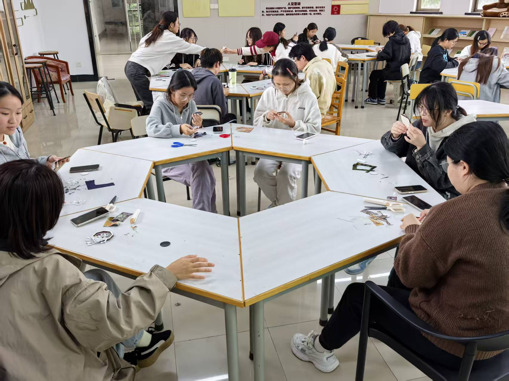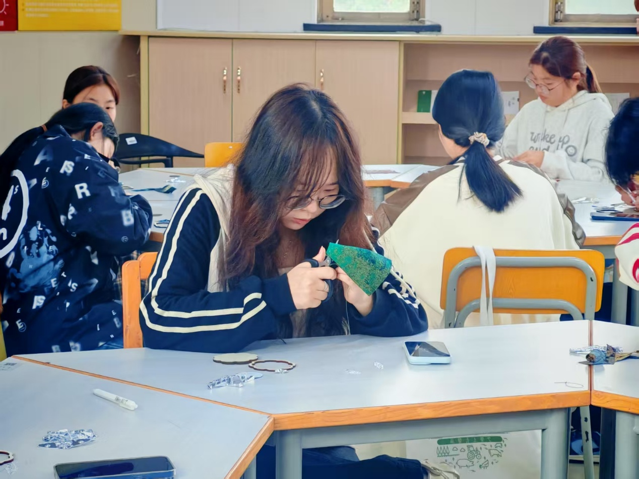 随后的手工创作环节中,同学们仔细端详、反复挑选心仪的苗银贴片,而后手执工具,小心翼翼地将这些充满寓意的元素拼贴于冰箱贴上。剪刀的开合声与贴片的组合声此起彼伏,每一个动作都凝聚着劳动的体温,每一次尝试都是对非遗技艺的亲身体验。在尚劳苑的活动空间里,劳动与文化相互交织,让苗银技艺不再是遥远的符号,而是在大家的指尖重新鲜活,于当代生活场景中焕发新生。