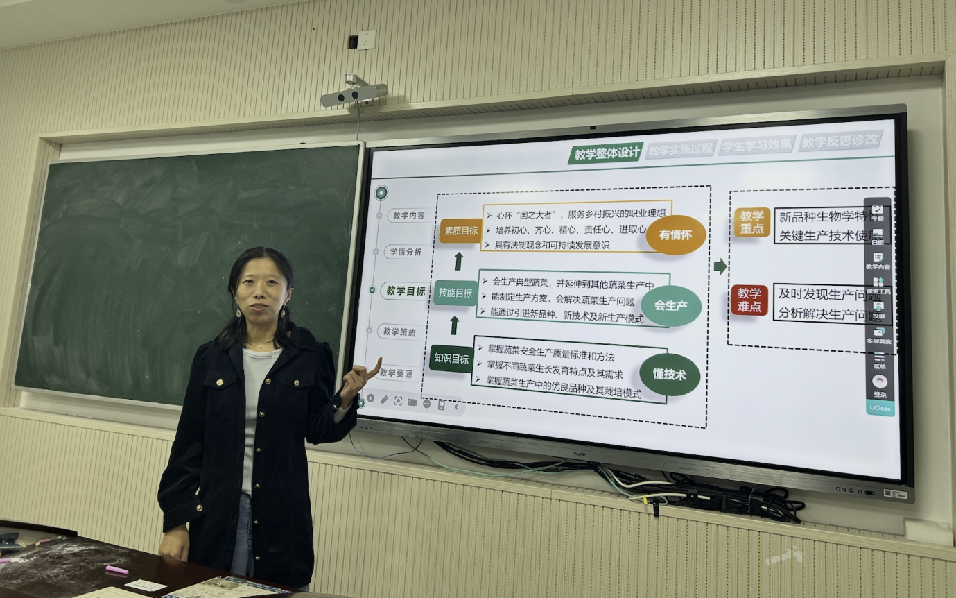 李真老师的《设施蔬菜生产》以“智慧农业场景化” 为特色,依托智能温室,以 “设施番茄栽培” 为案例,用物联网系统实时展示温、光、湿等环境因子对蔬菜生长的影响,实现“课本到田间” 的衔接,获教师们 “实用性强、形式新颖” 的好评。