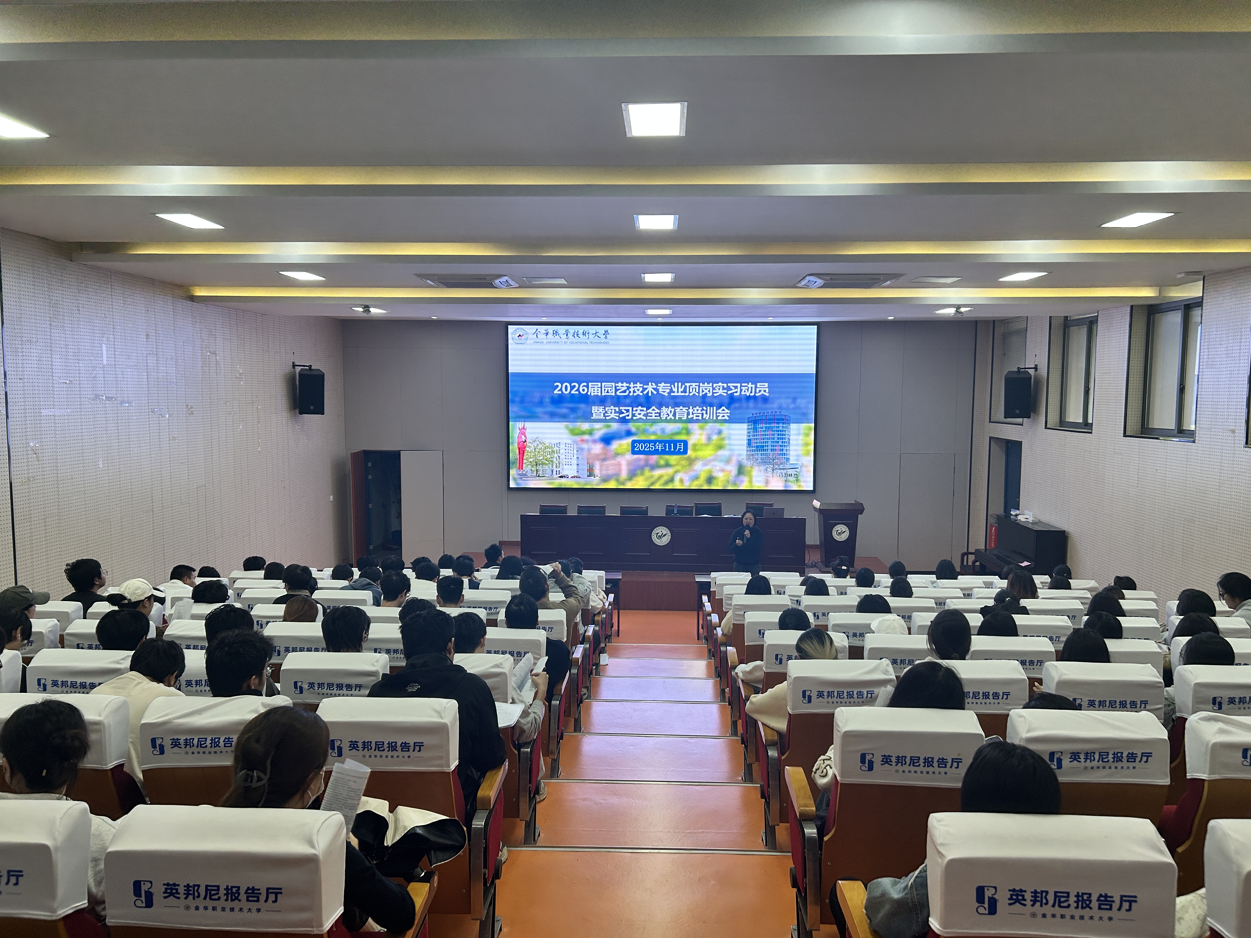 为扎实推进2026届毕业生岗位实习工作,明确实习要求,帮助学生平稳过渡至职业实践阶段,11月9日,金华职业技术大学农学院园艺技术专业在英邦尼会议厅召开实习动员大会。会议由专业主任刘健主持,全体2026届园艺技术专业毕业生参会,学院教学办王胜刚老师受邀现场答疑。会上,专业主任首先围绕岗位实习的核心要求展开说明,强调实习是专业人才培养的关键环节,详细解读了实习时长、岗位适配标准、过程性考核细则等核心内容。同时,还就实习期间的职业素养、安全规范、沟通协作等方面提出要求,鼓励学生珍惜实践机会,积累行业经验。
