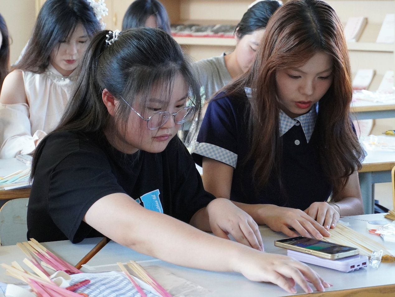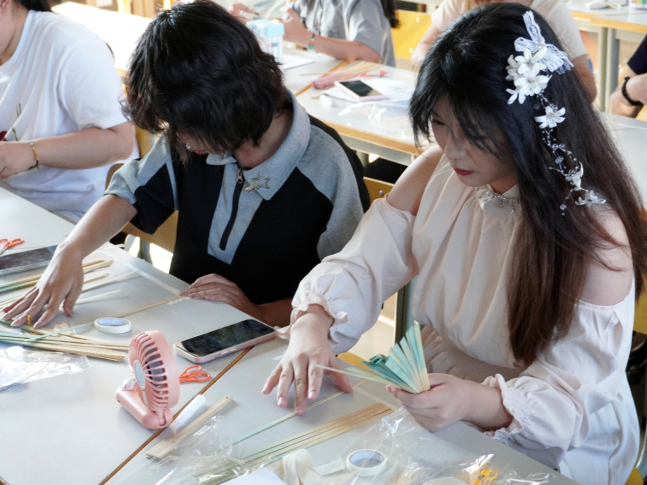 材料包分发完毕,一场“劳动实战”正式拉开帷幕。拿起竹条的瞬间,不少同学才体会到“劳动藏真章”——有的同学因力度不均,编出的扇面纹路忽松忽紧;有的在固定团扇柄时,因未等白胶完全凝固就松手,导致扇柄偏移………。一次次的拆改调整,让大家对“劳动需要耐心”有了更深的感触。