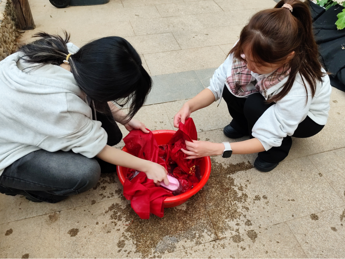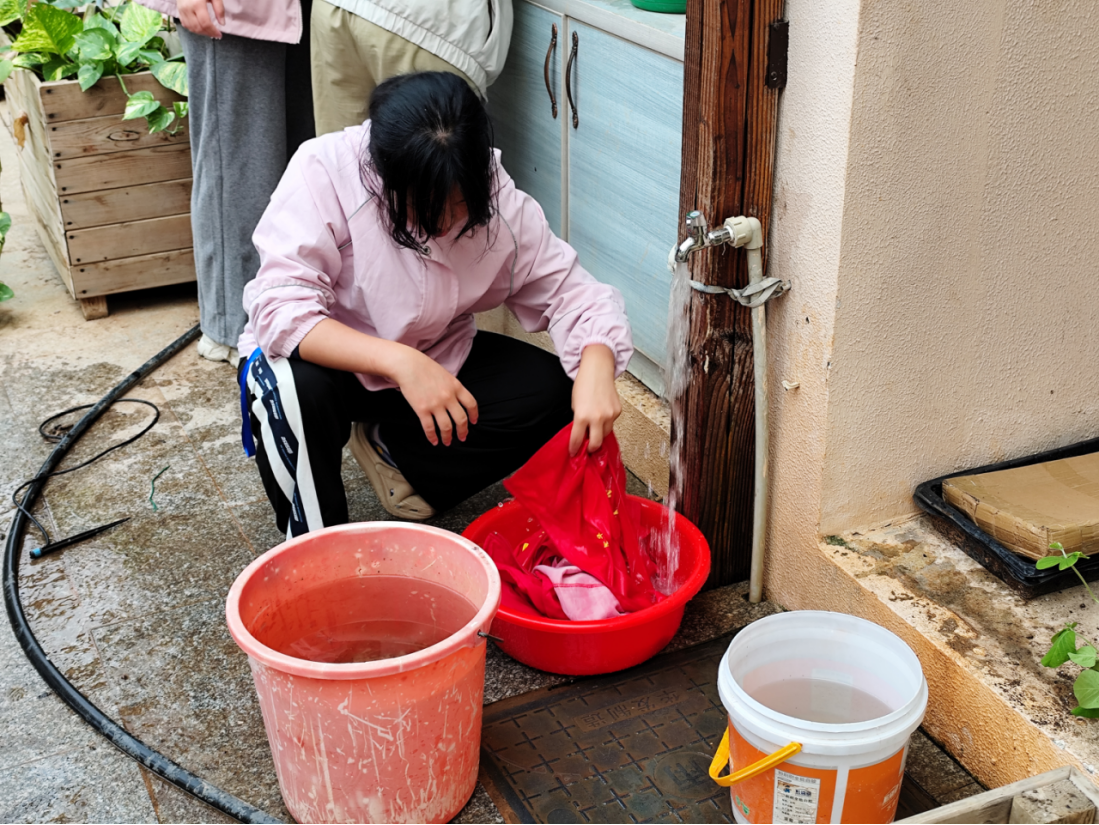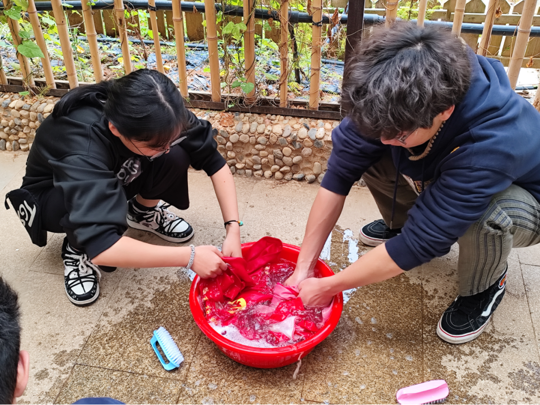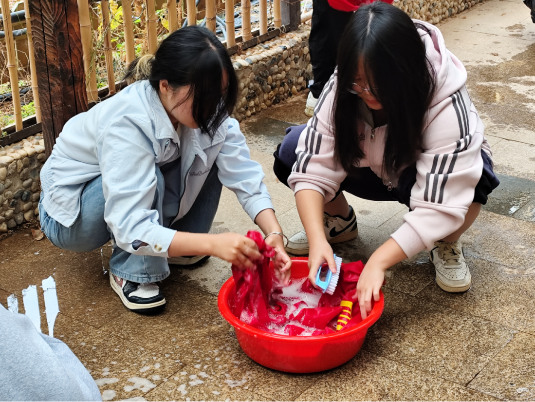活动伊始,青大队工作人员完成场地清洁与物资筹备,洗衣液、脸盆、刷子等工具有序发放。学生们两人一组,迅速投入到清洗活动当中。同学们仔细将志愿服浸入加好洗衣液的盆中,确保污渍充分软化,再针对衣领、袖口等易脏部位反复擦拭。清水不断冲洗间,原本沾着尘土的志愿服渐渐恢复鲜亮,洗净的志愿服整齐地挂在衣架上,排列在通风处,阳光洒在红色志愿服上,格外耀眼。整个过程中,没有一人懈怠,大家相互配合、彼此搭手,劳动的身影里满是团队协作的温暖。