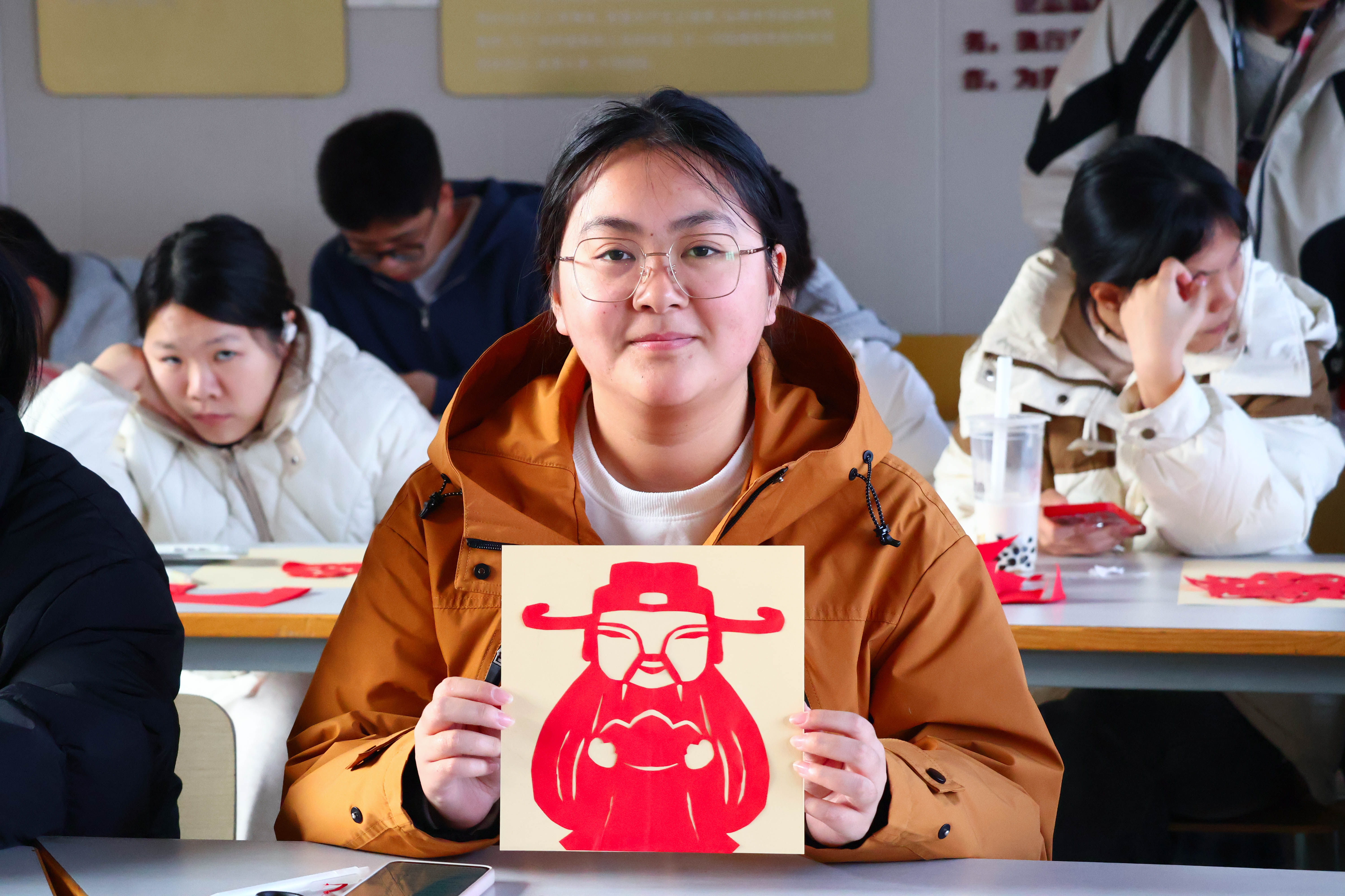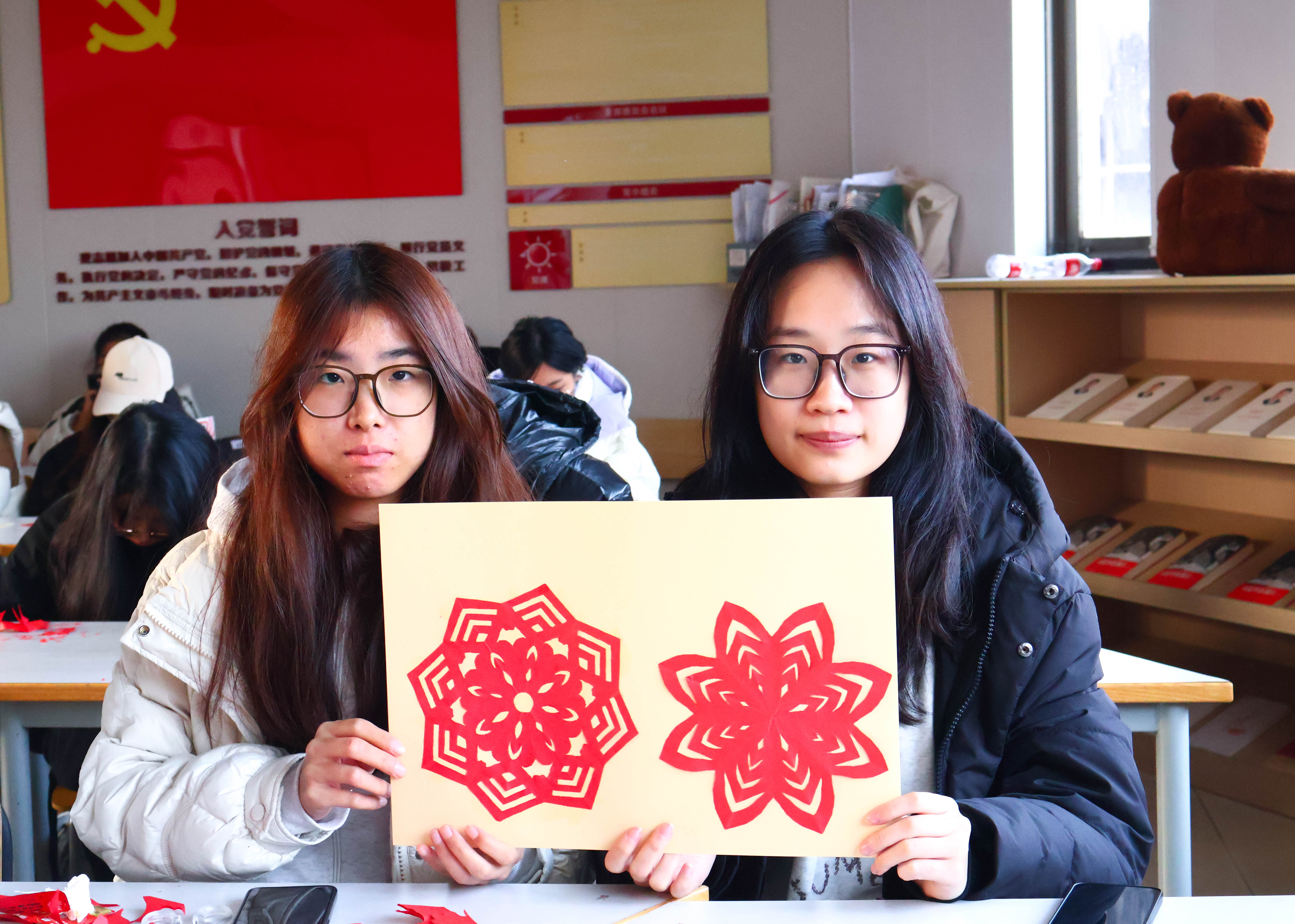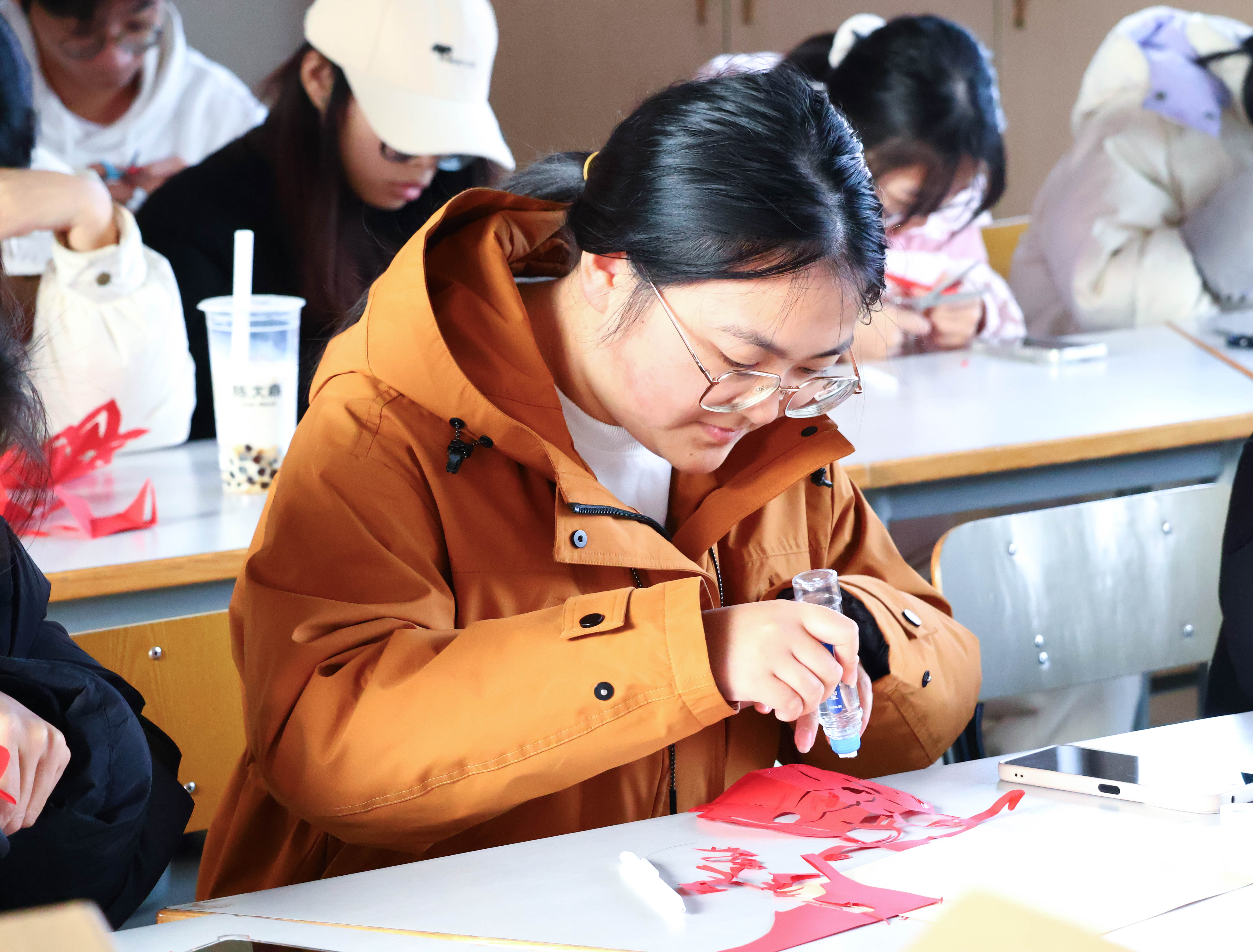 而新手小白们则在大师的耐心指导下,从简单的图案开始练习,逐渐掌握剪纸的技巧。他们或独自挥洒创意,或三两成群,互相交流、互相帮助,共同完成了一幅幅精美的窗花作品。活动现场洋溢着欢声笑语,剪刀的咔嚓声与同学们的笑语声交织成一首欢乐的交响乐。一张张红纸在巧手之下,变成了寓意吉祥、富贵的窗花,每一片都是对新年的美好祝愿,每一片都是对2025年的向往和期待。