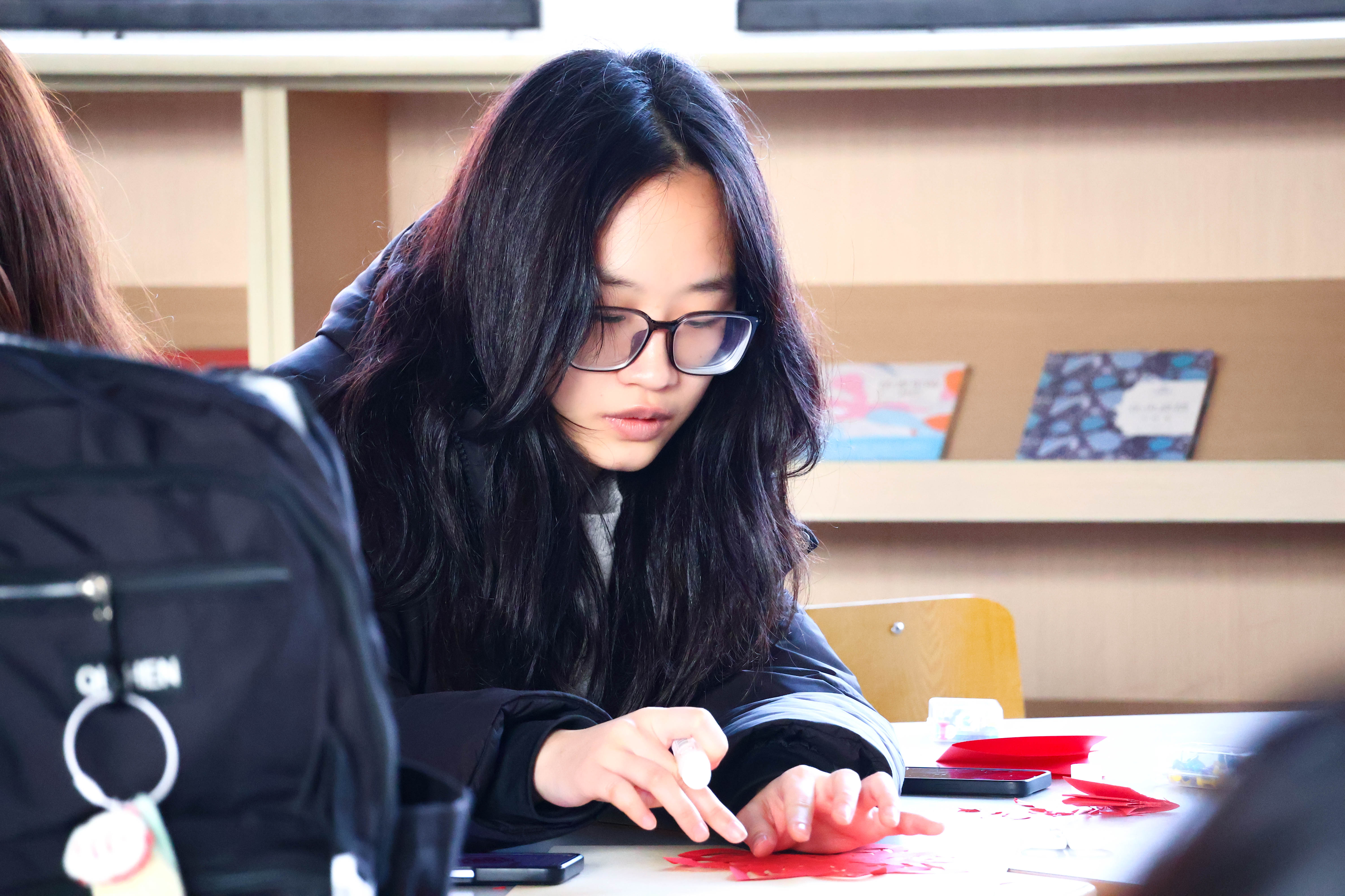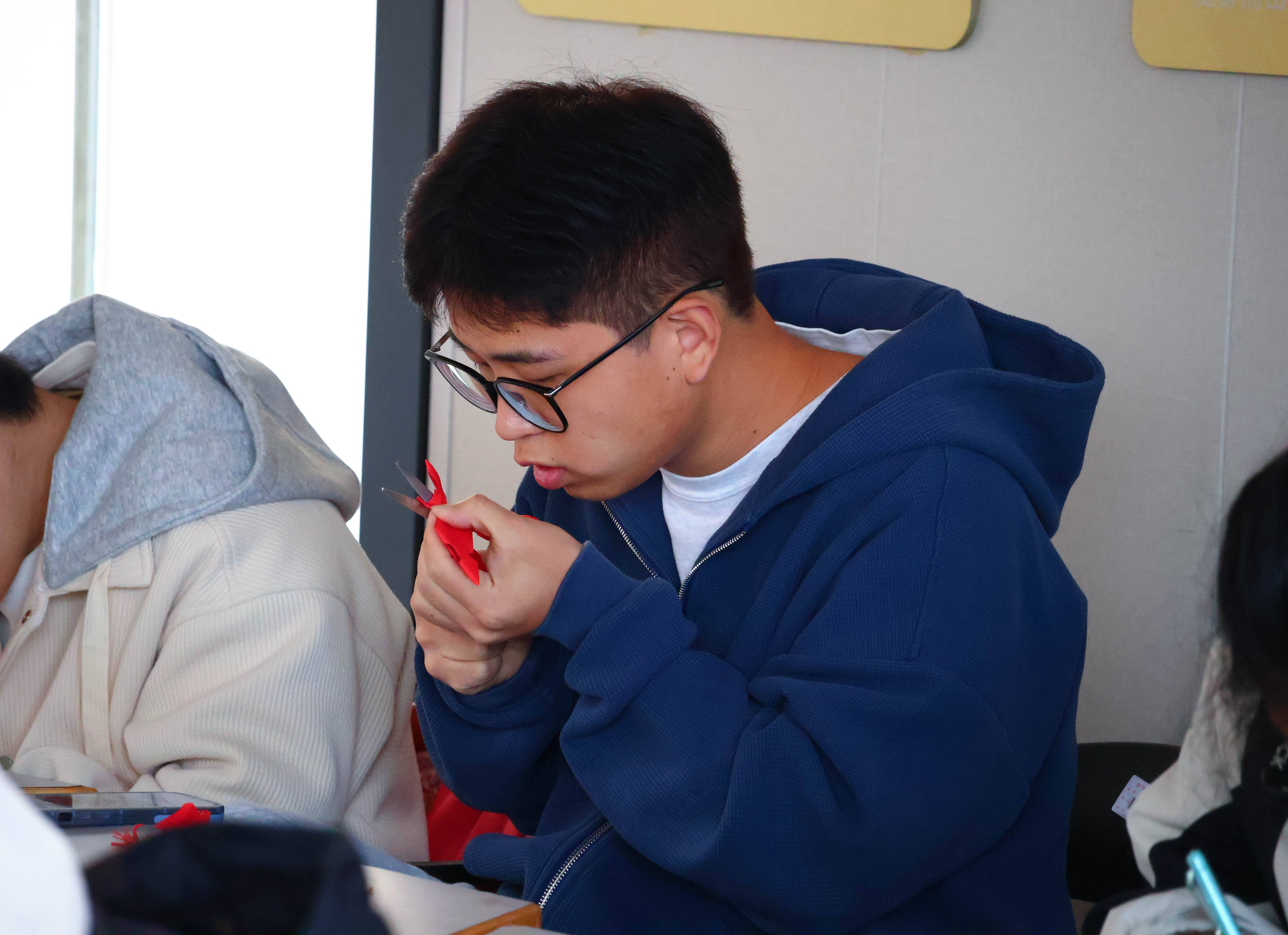 在剪纸大师的指导下,同学们纷纷动起剪刀,投入到剪纸创作中。活动现场有剪纸达人,也有新手小白。剪纸达人们凭借熟练的技艺,快速地裁剪出复杂的窗花图案,如精美的蝴蝶、灵动的金鱼等,引得周围同学的阵阵赞叹。
