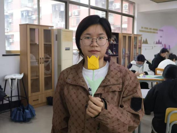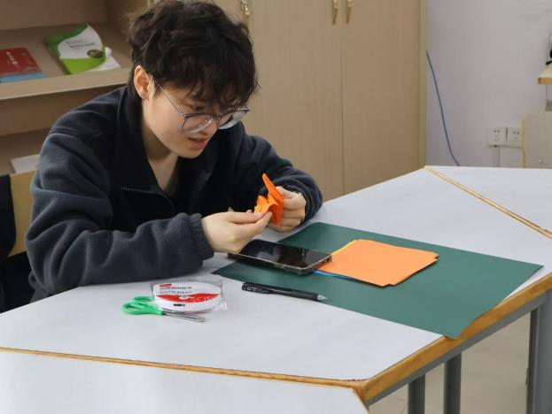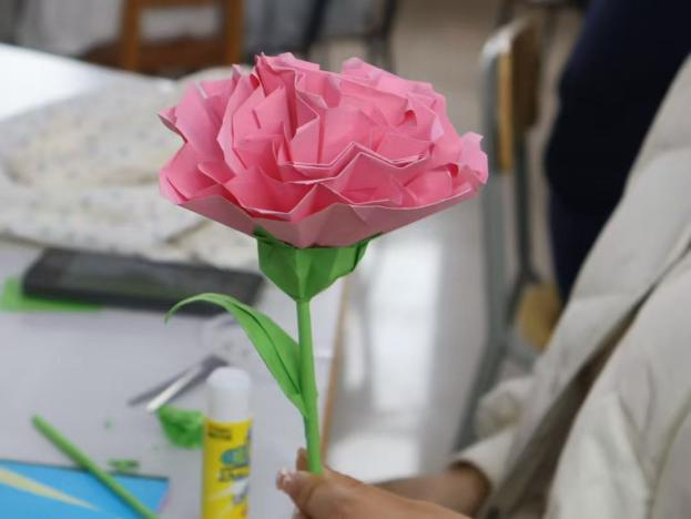 活动现场,工作人员早已备好种类丰富的折纸材料与清晰易懂的步骤示意图,还贴心准备了经典康乃馨花型的折纸教程,同时鼓励同学们自主查找喜爱的花型教程,发挥创意,折出属于自己的独特作品。同学们循着图示,一步步细致翻折、按压、塑形,互帮互助、彼此交流,分享着折纸过程中的小技巧与小惊喜,现场氛围温馨而热烈。